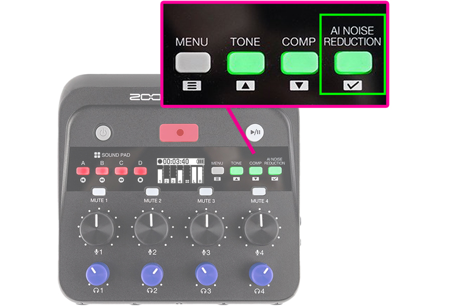 A redução de ruído por IA aprende e remove zumbidos, ruídos e sons da rua, proporcionando uma fala clara e natural. A modelagem de timbre adiciona refinamento e calor com equalização e de-esser, enquanto o compressor integrado suaviza gritos repentinos, risadas e sussurros. Botões dedicados para microfone, botões de mudo e controles de transporte retroiluminados mantêm sua mixagem equilibrada e fácil de gerenciar. A orientação por voz fornece descrições audíveis do menu, permitindo uma navegação fácil sem precisar olhar para a tela.